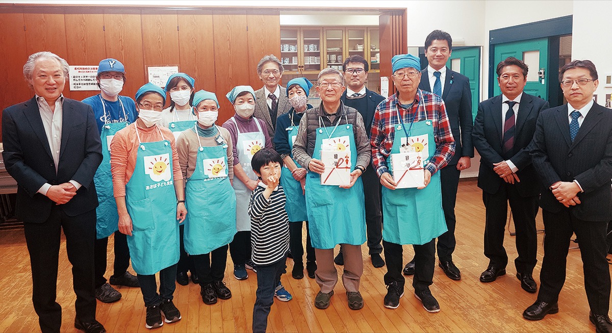 区内4カ所で毎週水曜の午後5時30分頃から6時30分頃まで、子ども100円、大人200円で温かいおにぎりと具だくさんの味噌汁を提供している同実行委員会。もえぎ野地域ケアプラザで行われた寄贈式には、三谷英弘衆議院議員も出席した。両団体は昨年度も同様に寄付をしているが、今後も継続して支援していく意向だ。