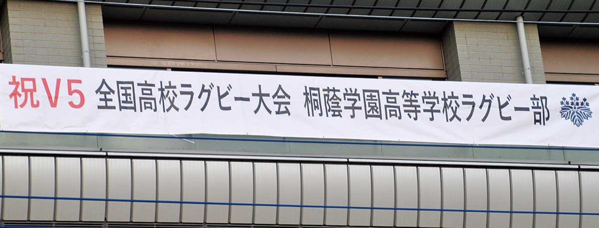 「祝Ⅴ5 全国高校ラグビー大会 桐蔭学園高等学校ラグビー部」と記された横断幕は大きさ縦約1m×横約8m。区役所の横浜上麻生線側に掲示されている。