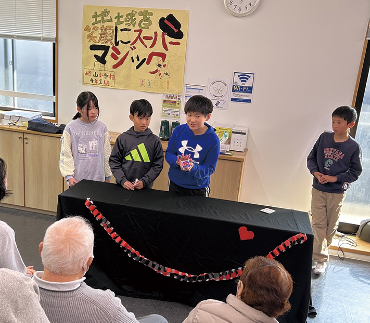 嶮山小学校4年1組(梅本樹徳教諭)の児童32人が地域住民を招いて、すすき野地域ケアプラザで1月21日、マジックショーを開催した。