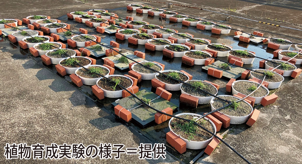 植物育成実験は24年5月から行われている。配合比率ごとに、紙おむつから生成した肥料を配合した19種類の実験用培養土を入れたプランターに緑化植物「クラピア」を植栽。植被率を指標に育成状況を定期測定し、2回越夏させる。この度、1回目の越夏が終わり、複数の配合比率で既存培養土と同等の植被率が認められた。
