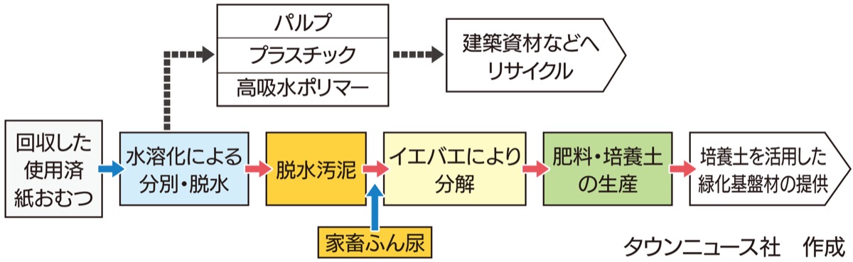 環境省によると、国内では高齢化の進行に伴い、大人用紙おむつの消費量が年々増加している。30年度には、子ども用と大人用を合わせた使用済紙おむつ排出量が、一般廃棄物処理量の約7・0%を占める約260万トンに達するとされている。現在、廃棄する紙おむつの多くは焼却処理されており、パルプ等の素材のリサイクル促進が課題となっている。