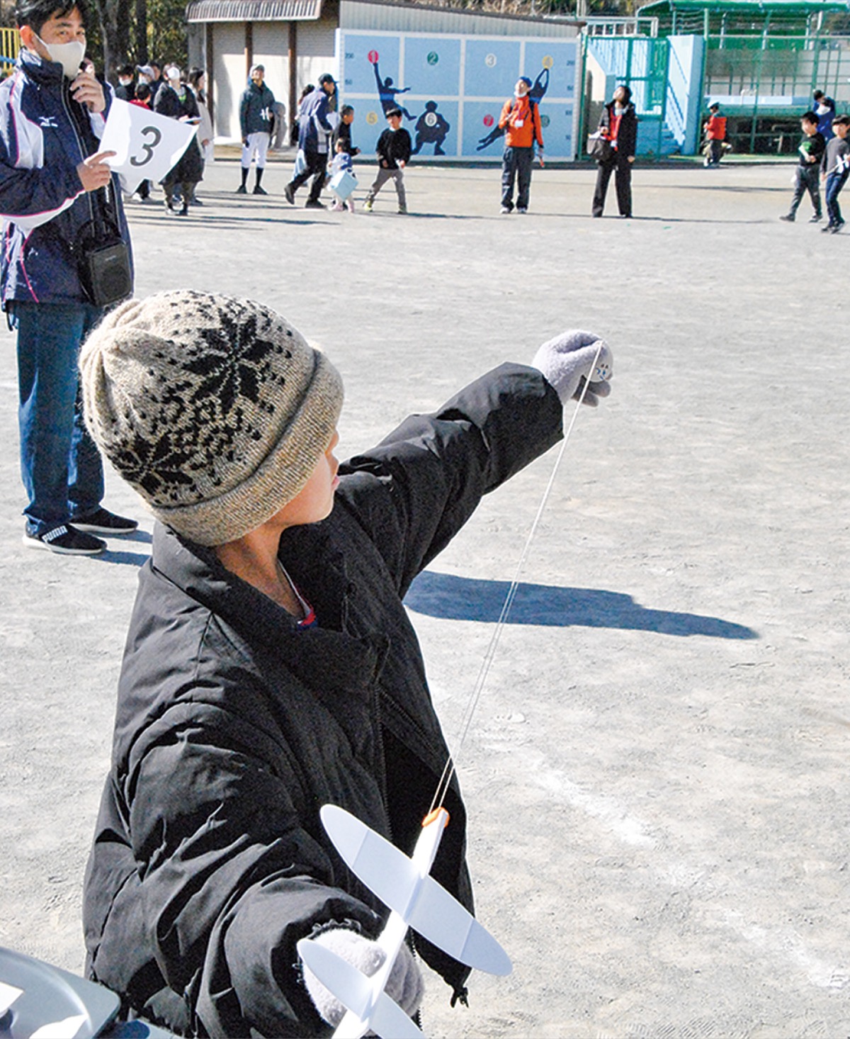 組立式の飛行機を手や道具を使って飛ばし、その滞空時間を競う「中里地区ヒコーキ大会」が2月8日、鉄小学校で開催された。中里連合自治会主催の同大会は、1991年から毎年2月に行われてきた中里地区の恒例行事だ。昨年は雨のため室内での実施だったが、今年は晴天に恵まれた。