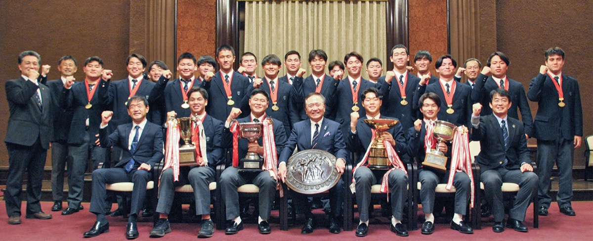 あいさつに立ったラグビー部の古賀龍人副主将は「この場で2連覇を報告できることをうれしく思う。後輩たちに3連覇を託したい」と話し、溝上慎一理事長は「スター選手が少ない中、後半に向けてチームがまとまり強くなった。高校スポーツとして理想の形」と称賛した。