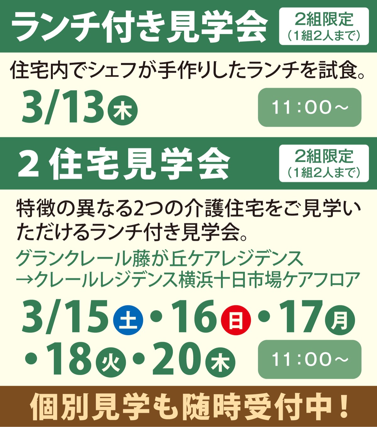 同施設ではランチ付き見学会や特徴の異なる2住宅を比較できる見学会などを無料で開催している。事前に下記まで申込を。応募多数時抽選。