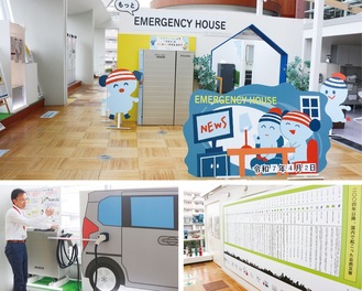 リニューアルは、壁面に掲示していた2000年から20年間の国内の自然災害を記していた年表を、授業の一環で訪れる小学生にとって一番身近な震災である「能登半島地震」を含めた04年から24年までの20年間にリニューアル。また、新たに段ボールベッド、給水タンク、非常用トイレなどの防災設備や、電気自動車の模型を使った充放電器のプラグの抜き差しなどが体験できるコーナーが新設された。