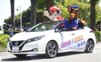 前半の「キッズパレード」には、人気アニメ「パウ・パトロール」のキャラクター「チェイス」や「マーシャル」らがオープンカーなどに乗って登場し、沿道の子どもたちに手を振って笑顔を誘った。