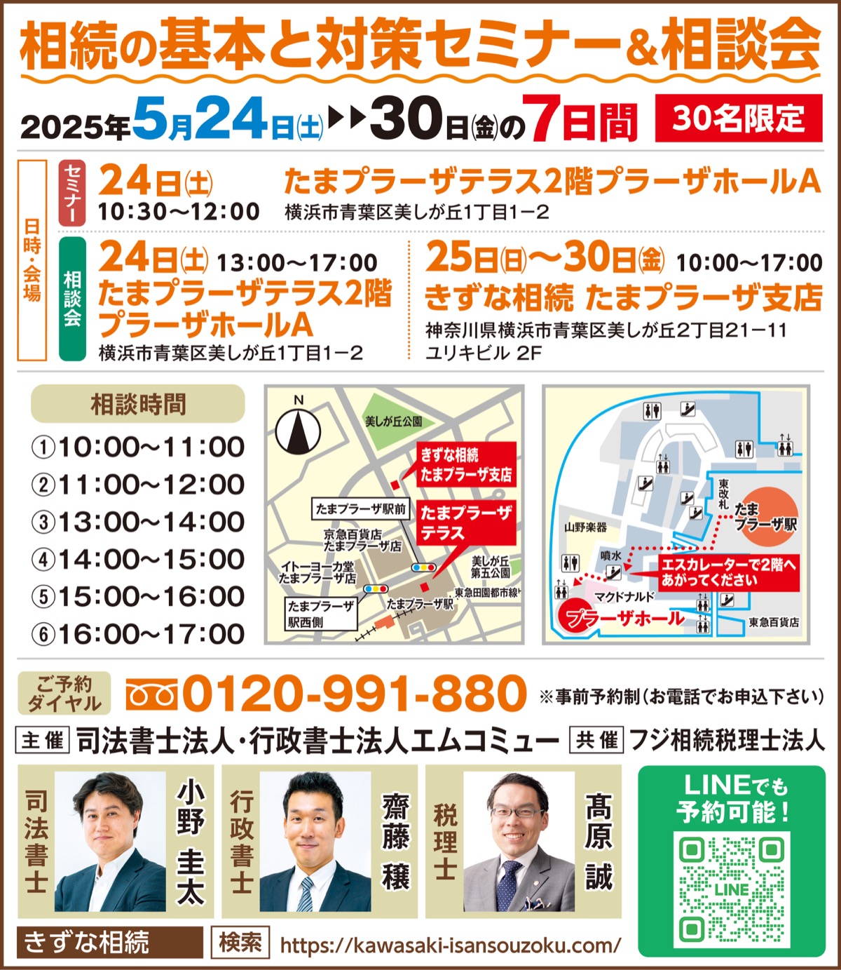 日程は、セミナーが24日の午前10時30分〜正午まで(会場:たまプラーザテラス2階プラーザホールA)。相談会は24日午後1時〜5時(同会場)、25日〜30日までは午前10時から午後5時まで(会場:きずな相続たまプラーザ支店)開催される。