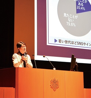 佐々木氏は講演で、思い込みで騙されてしまう動画やクイズを披露。「思い込みや先入観で誤った判断を下してしまうことは日常茶飯事。情報を正しく捉える判断力を身に付けてほしい」と呼び掛けた。