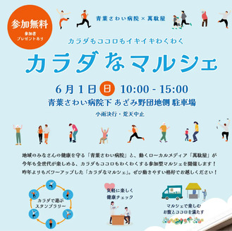 全世代が健康について楽しみながら学べる参加型イベント「第2回 カラダなマルシェ」が6月1日(日)、青葉さわい病院下あざみ野団地側駐車場で開催される。午前10時〜午後3時まで。主催は青葉さわい病院と萬駄屋。