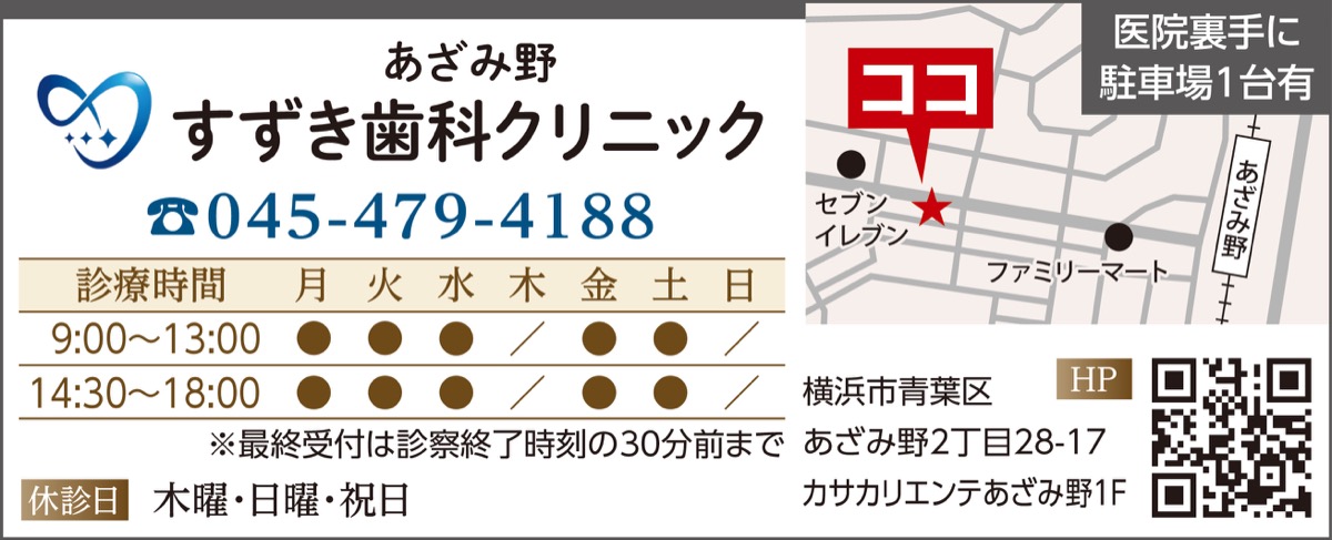 「痛みが出てから歯医者へ」という従来の考えから「未然に防ぐ予防歯科」へ。あざみ野駅から徒歩5分のあざみ野すずき歯科クリニックでは、この新しい歯科医療のスタンダードを重視し、患者一人ひとりに合わせた治療法を提案している。