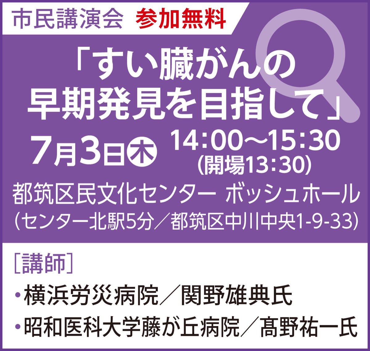「すい臓がん」の早期診断について学ぶ市民講演会が7月3日(木)、都筑区民文化センターボッシュホール(センター北駅5分)で行われる。