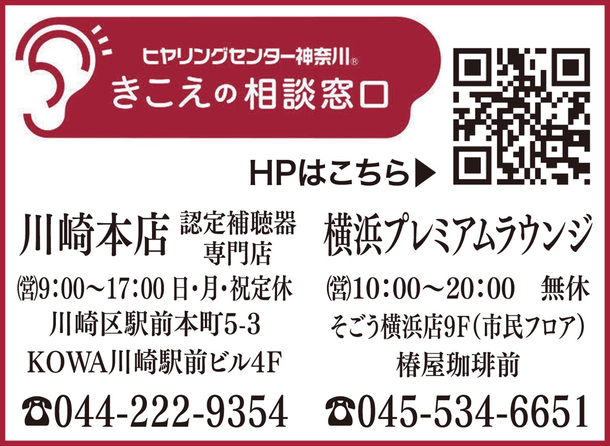 創業36周年を迎えるヒヤリングセンター神奈川は、川崎駅前(川崎本店)、そごう横浜店9F(横浜プレミアムラウンジ)に店を構える補聴器専門店。どちらも駅から徒歩3分の好立地で、認定補聴器技能者資格を持つスタッフが在籍中。
