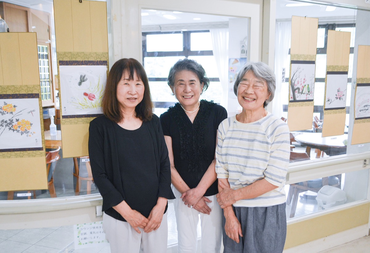 黒須田在住の福井悠子さん(86)、天野啓子さん(79)、河口典子さん(69)による彩色水墨画展「福井悠子と仲間たち」が7月27日(日)まで、特別養護老人ホーム「緑の郷」で開催されている。