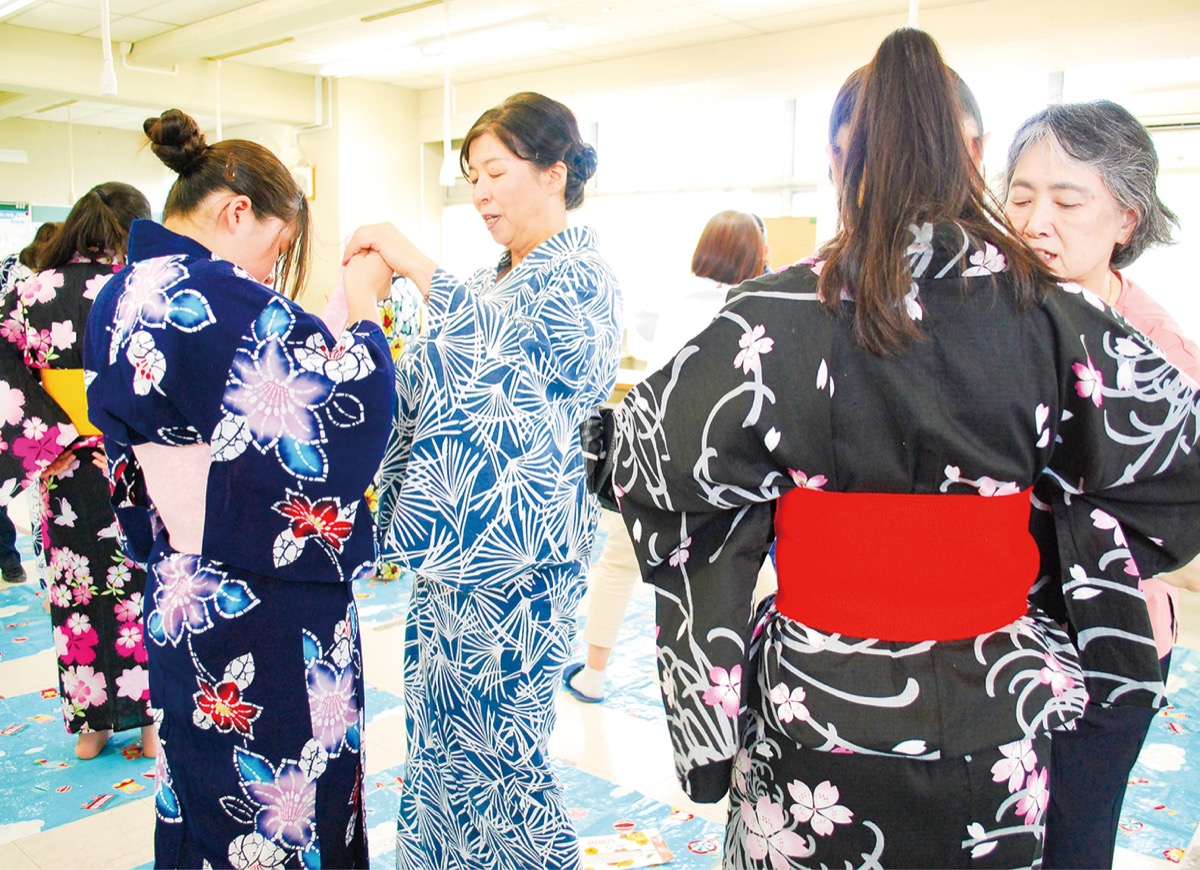 取材したのは7月1日。講師の手本を見た生徒たちは、事前に選んだ思い思いの浴衣を羽織り実践スタート。後ろ手におはしょりを整え、長い帯を一人で巻き、慣れない動きに戸惑いながらも着付けに挑んだ。華やかな和柄を身にまとうと、互いに顔を見合わせはにかみ笑い。生徒の一人は「日本の伝統に触れられて楽しかった。今年の夏祭りは自分で浴衣を着たい」と声を弾ませた。