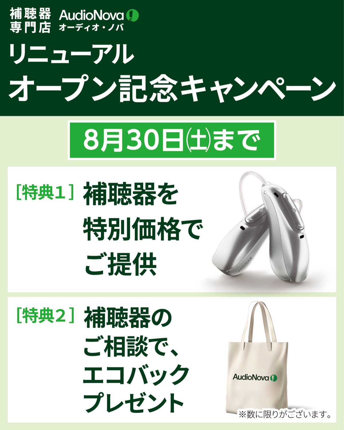 オープンを記念し、8月30日(土)まで補聴器を特別価格で提供。相談者にはエコバックを数量限定でプレゼント。「『最近、聞き返すことが多くなった』『テレビの音が大きい』といわれる方、どうぞお気軽に」