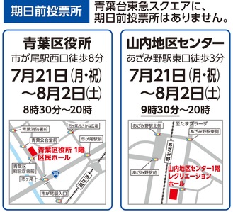横浜市長選挙が8月3日(日)に投開票される。投票時間は午前7時から午後8時まで。青葉区選挙管理委員会は「当日の投票が難しい方は、期日前投票をご利用ください」と呼びかけている。