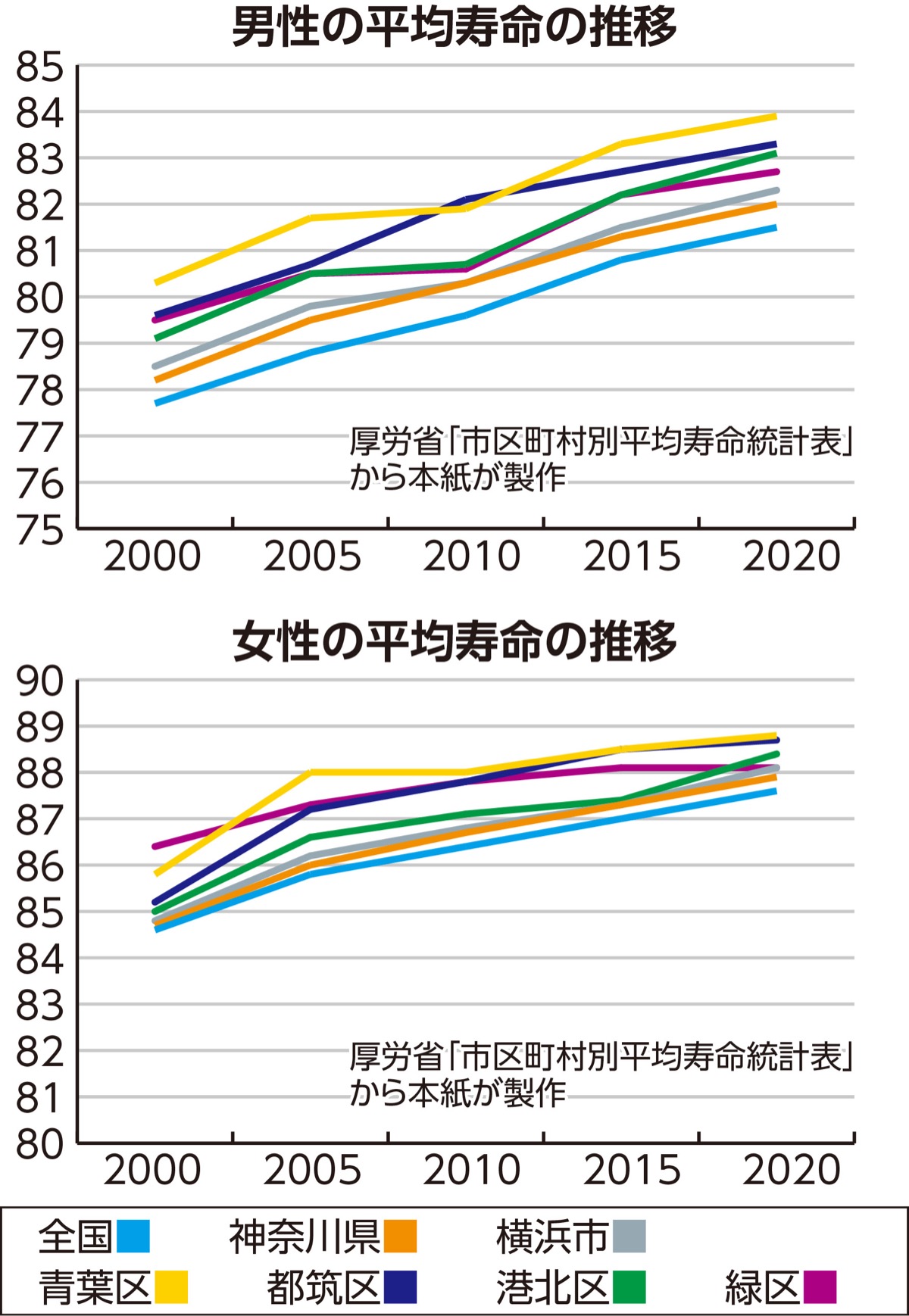 厚生労働省の市区町村別生命表(2020年データ)によると、男性の平均寿命は青葉区が83・9歳で全国2位、都筑区が83・3歳で同8位と全国のトップ10に入っている。北部4区は男女とも全国、神奈川県、横浜市の平均を上回っており、全国トップクラスの「長寿地域」となっている。
