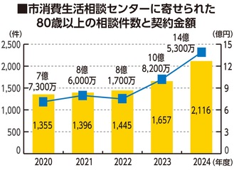 市消費生活総合センターに寄せられた24年度の消費生活相談は1万6638件で、23年度から1634件増えた。消費生活相談における契約金額は125億5千万円で、23年度の122億7千万円を上回っている。
