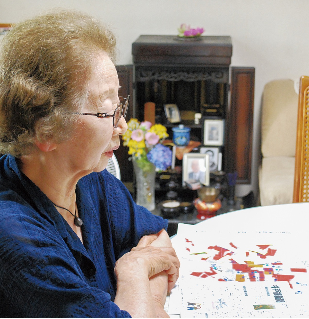 「東京大空襲の新聞記事や写真、全部取ってあるの」とSさん(93)。空襲で焼けたエリアが赤や黄に色付けされた、隅田川周辺の地図をテーブルに広げる。当時の自宅は言問橋にほど近い川っぷち。色付きの地図が、そのすぐ手前まで火の手が迫ったことを物語る。