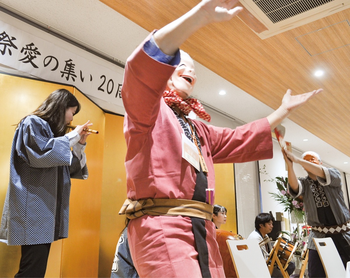 祝宴は、20年間の思い出を振り返るビデオをBGMににぎやかに進行。各宮のお囃子や太鼓練習、法螺貝などの披露も行われた。お囃子披露では各宮が共演し、ひょっとこ面や獅子舞と共に会場を盛り上げた。驚神社の鳥居補修時に出た端材を使用し、会員らで協力して作り上げた特別な記念木札も配られた。