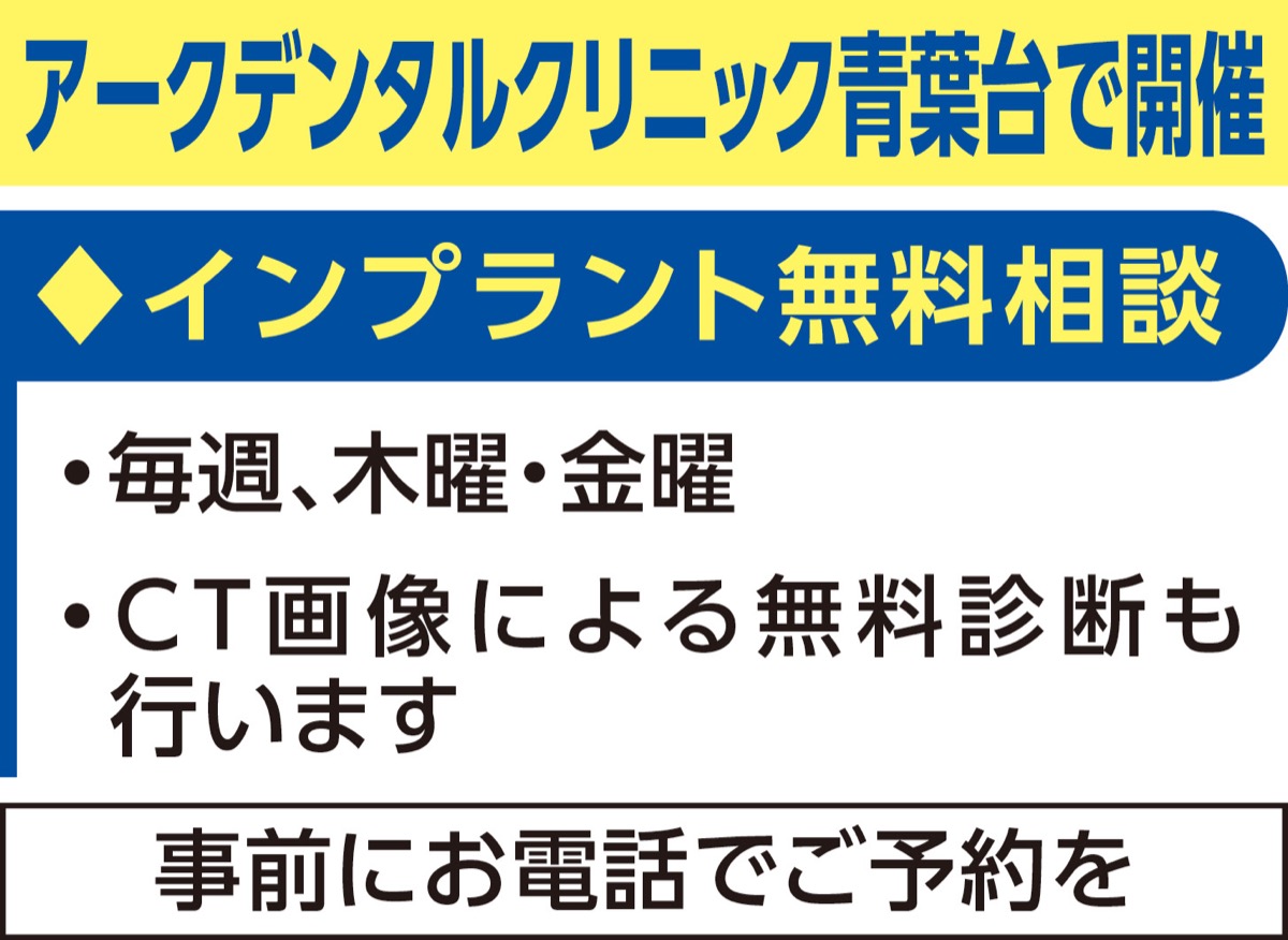 「『最近、ものが噛みづらくて』という方、気軽にご相談ください」。そう話すのは、「アークデンタルクリニック青葉台」(ほか港北区に1院)を運営する医療法人社団翔栄会の須田孝則理事長)だ。同院では、インプラント無料相談を実施している。