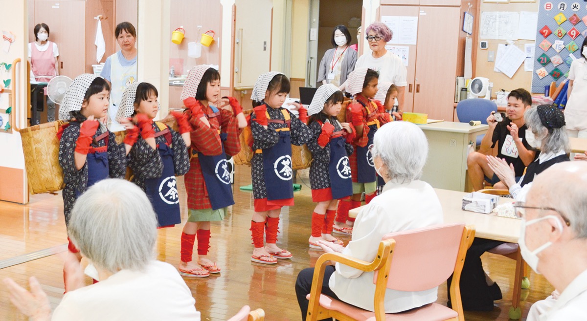 年長組は最年少が5歳、施設利用者の最年長が95歳で最大90歳差の交流となった同催し。女児たちは半纏にカゴを背負った村娘衣装で、昭和歌謡『ちゃっちゃ茶畑』に合わせて軽快にダンスを披露。白井園長は「自分も大好きで、目白までレコードを探しにいったこの曲。楽しんでもらえれば」と場を和ませていた。