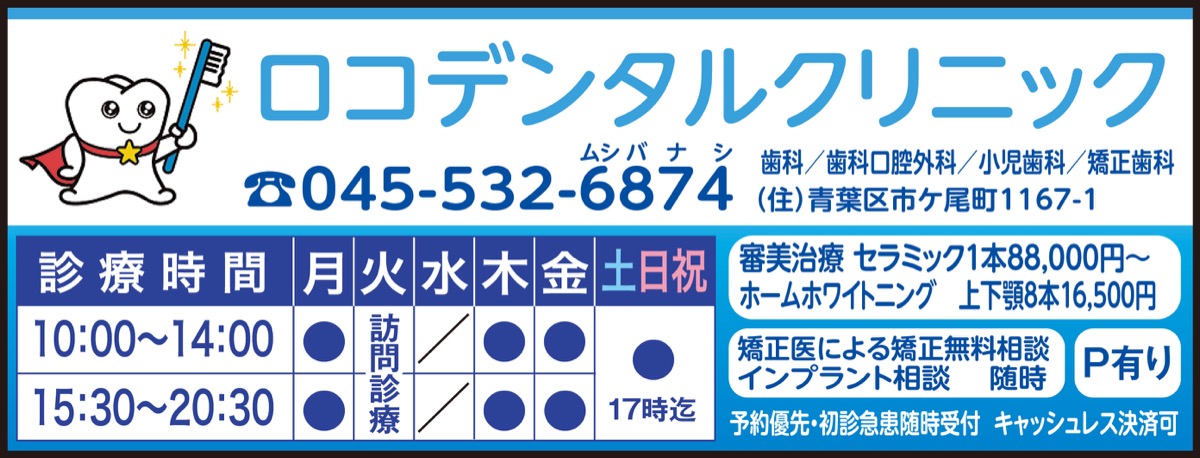 市が尾駅徒歩3分。平日は20時半、土日祝も17時まで開院し、初診の急患も受入れている。「車で来院の際は、当院裏のコインパーキングを利用してください。30分無料券配布のため、必ず利用証明書の持参を」。詳細はHPへ。