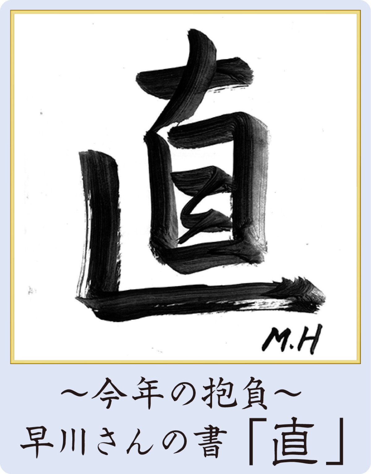 そんな早川さんの今年の抱負は「直」。「人を信じられなくなっている今、必要なのは人間としての道を外れず、素直であり、信念を持って生きること」と力強く語る。