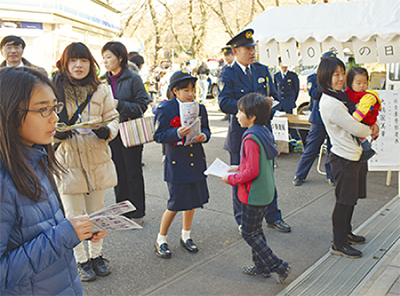 1月10日は「110番の日」として毎年、区内でキャンペーンを行っている。署員のほか、地元の自治会関係者ら約40人が参加した。参加者らは、110番の正しい使用方法を記したチラシを配り、緊急時のみの利用を呼びかけた。実際に電話を使った通報体験やパトカー体験乗車も行われ、楽しむ親子連れの姿が見られた。