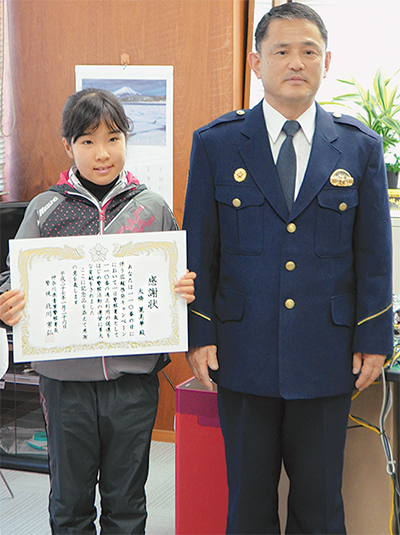 青葉警察署(北川常弘署長)は1月26日、「110番の日キャンペーン」で一日署長を務めた区内在住ジュニアテニス選手の大橋麗美華さん(11)に、感謝状を贈った=写真。