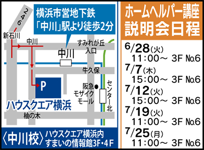 かながわ福祉保健学院はヘルパー2級をはじめ、介護福祉士やケアマネージャー等、介護に関わる人材を育てる養成機関。県内各所に教室があり、現在中川・長津田教室のヘルパー2級受講生を募集中。受講料は79000円。分割払いもOK。なお同学院提携機関に就業すれば、受講料全額キャッシュバック制度も。その他学割等もあり。受講希望者はまずは説明会へ。