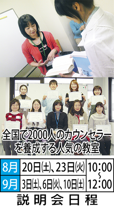 同校はNHKや新聞、雑誌でも数多く取り上げられ、カウンセラーや資格取得希望者はもちろん、「実践的で日常生活にも役立つ」として、主婦など一般の受講者も多い。そんな同校では、講座内容と心理カウンセラーの現状について学べる説明会を実施中。「社会貢献したい」「カウンセラーになりたい」「自分自身について学びたい」という方は気軽にお電話で申し込みを。
