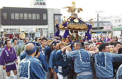大石神社を10時に宮出した御輿は、東向地自治会や杉山原自治会、下長津田自治会などを通り、16時半ごろに長津田駅前へ。「エイサッ!」と大きな掛け声とともに御輿が到着すると、駅周辺に集まった多くの見物人から拍手が送られ、大きな歓声があがっていた。