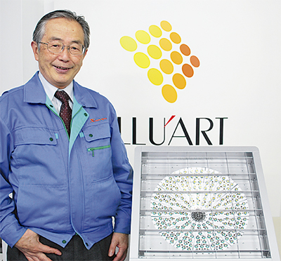 同社は、平成21年にイルテットの開発をスタートさせた。体育館や工場、倉庫などの屋内高天井での使用用途に適した、明るく鮮明なパワーLED照明となっている。最大の特徴は、光の均一性を現す均斉度の高さ。従来のLED照明の弱点であったムラになる配光を基盤自体に傾斜をつけるなど独自の設計により克服している。
