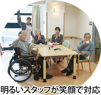「ここがわが家だと思って過ごしてもらえるように」とスタッフが話すように、『花物語かもい』は皆笑顔いっぱいで利用者に不便のないようサポート。これまでの生活リズムを大切にし、その人に合った暮らしをお手伝いする。外出も散歩はもちろん、買い物など普段のまま。経験豊富なスタッフが24時間フロアごと常駐し、ケアにあたるので安心だ。価格設定も他社に比べリーズナブルなのも好評で「ここなら、とご依頼頂いています」と施設長。