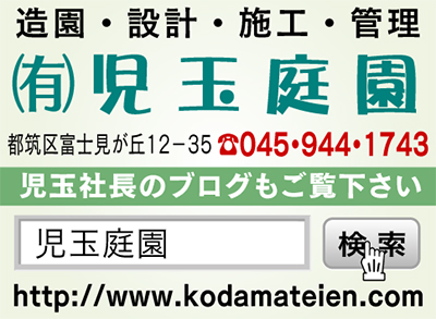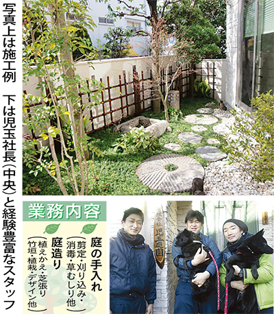 都筑区富士見が丘の『(有)児玉庭園』は、地元都筑区や緑区内の造園を手掛ける地域密着の植木屋。児玉俊二社長は、生まれも育ちも都筑区でこの道約20年。他の社員も20、30代と若いが造園技能士の資格を持ち経験が豊富だ。