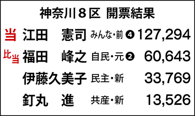 「第46回衆議院議員総選挙」が12月16日投開票され、神奈川8区(緑区・青葉区)では、江田憲司氏(みんな・56)が約12万7千票を獲得し、圧勝した。小選挙区で敗れた福田峰之氏(自民・48)は、比例南関東ブロックで復活当選し、国政返り咲きを果たした。