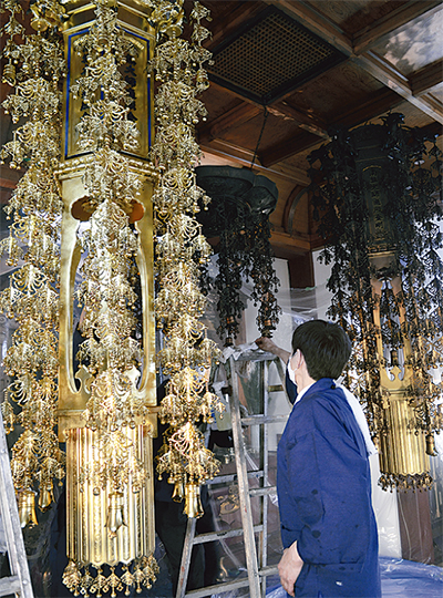 長津田町にある高野山真言宗福泉寺(杉本久明住職)で1月22日、本堂内に吊るされている金メッキが塗られた仏天蓋(ぶってんがい)や幢幡(どうばん)などの清掃が行われ、設置された約40年前の輝く姿に戻った。
