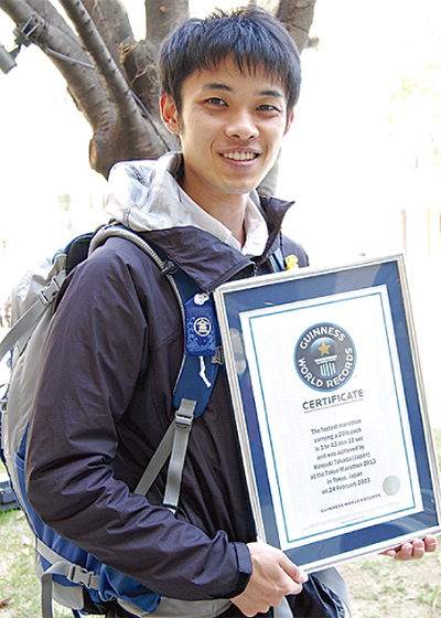 東本郷在住の高田裕之さん(28)が先月行われた東京マラソンで、「20ポンド(約9・07キロ)の荷物を背負って走った最も速いマラソン」のギネス世界新記録をマークした。3時間43分33秒で東京の街を走り抜け、従来の記録を約6分更新した。