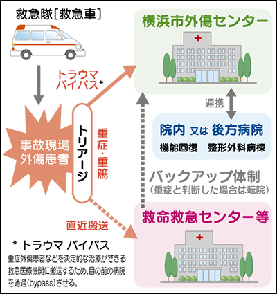 横浜市外傷センターは市の外傷診療の拠点として、交通事故や多発外傷などの重症外傷患者の救急搬送を集中的に受け入れる。