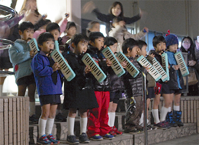 近隣のむつみ幼稚園から園児らが駆けつけ、ピアニカの演奏で会場を盛り上げた。