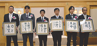 これは、異業種交流を通じ地域活性化を目指す「神奈川21世紀の会」(毎日新聞社主催)の活動の一環で、1998年に会が発足して以来実施されているもの。大賞には昨年ベルギーで行われた体操世界選手権で床運動の世界王者となった白井健三選手(岸根高2年)のほか2団体が受賞した。白井選手はスピーチで五輪について触れ「両親やコーチに迷惑をかけている分、演技で恩返ししていく。19歳でリオデジャネイロ五輪を経験して、23歳で迎える東京五輪に照準を合わせていきたい」と抱負を語った。受賞者には昨年毎日書道展で文部科学大臣賞を受賞した書道家、船本芳雲氏による書が副賞として贈られた。