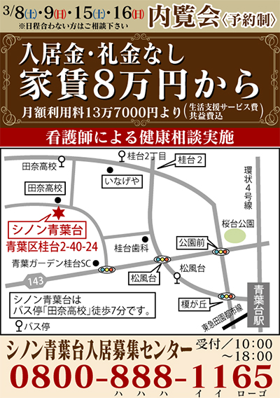 「ひと目見て気に入ってしまった」―昨年10月にオープンした、サービス付き高齢者向け住宅「シノン青葉台」には、そんな入居者の方も珍しくないという。東急田園都市線青葉台駅からバス7分「田奈高校」下車、閑静な住宅街の中にたたずむ同住宅は、全面バリアフリー、高齢者向け付帯サービスのある賃貸住宅。医療クリニックやデイサービス(5月開所予定)、訪問介護事業所も併設。居室には見守りセンサーや緊急ボタン設置、24時間スタッフ常駐なのも安心。「一人暮らしで健康不安もあり、すぐ誰かに相談できたり、見守りのあるところで生活したい」「夫の介護が必要となったが、二人で暮らし続けたい」そんな方々のニーズにこたえる住宅となっている。