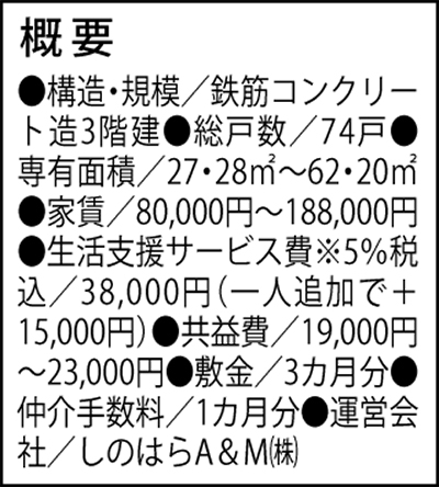 家賃8万円〜、サービス費と共益費を含めても13万7000円〜と検討しやすい料金体系となっている。空き室も残り少なくなってきているので、内覧希望の方はお早目にご連絡を。