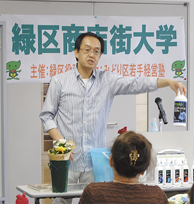 初めて緑区役所以外での開催となった今回は、長津田「かない生花店」の金井俊幸さんが「なぜお花は長持ちしないのか?」をテーマに講演。花を長持ちさせるポイントを参加した30人ほどの区民に紹介した。「花瓶は毎日洗剤で洗浄する」「ハサミは使用後、除菌する」などのこだわりが伝授されると参加者から「なるほど」「そうだったんだ」などの感嘆の声が聞かれた。区は「この機会を生かして商店街と消費者には互いに顔の見える関係を築いてもらいたい」と話していた。