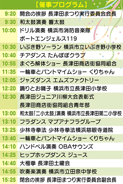 また、いぶき野小児童が「いぶき野ソーラン」、長津田小児童が「踊りとお囃子」、長津田第二小児童が「和太鼓演奏」を行い、会場を盛り上げる。問い合わせは、長津田まつり実行委員会【電話】045・981・0315。