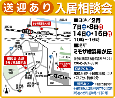 介護・看護が必要になった場合は、近隣施設の「ミモザ横浜霧が丘」の訪問による介護サービス・訪問看護等の介護サポートサービスが利用できる(別途契約)。興味のある方はまずは、入居相談会へ来場を。