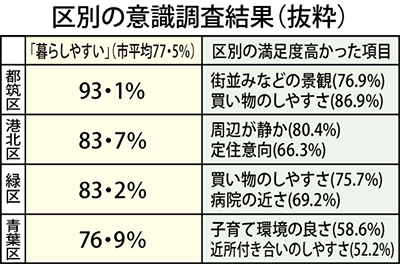都筑区は街並みの景観の良さ、病院の近さなど、多くの項目で満足度が高く、「暮らしやすい」と感じている人が93・1%で、市内最高。港北区の満足度は83・7%。周辺の静けさへの満足度が高く、「住み続けたい」と感じる定住意向が高いことが分かった。緑区は83・2%で、普段の買い物する場所や病院の近さへの満足度が高かった。市内でも人気エリアである青葉区は子育て環境の良さや近所付き合いのしやすさが高かったが、満足度は76・9%で市平均を下回った。市政策局担当者は「青葉区は生活環境も整っている地域。母数の少なさも原因と考えられ、細かい分析が必要」と話す。