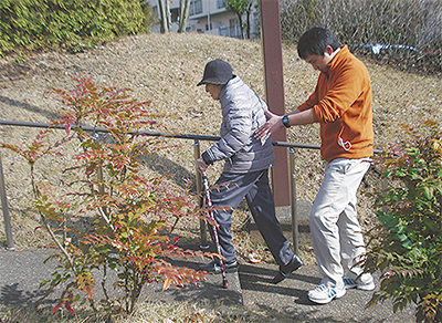 理学療法士による訪問では、機能訓練だけではなく、家族の介助方法の指導、手すり等の住宅改修や車いすやベッドのアドバイスを行っている。また、自宅でのリハビリテーション以外にも、買い物訓練として実際に近所のスーパーに行き、段差昇降や注意点、歩行器や杖の使用方法の指導も行っている。