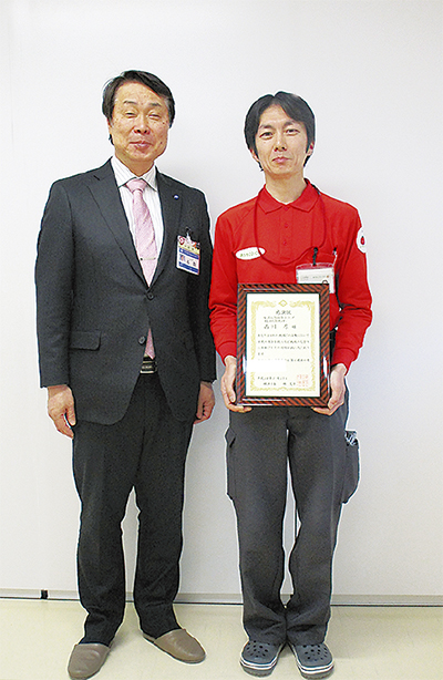 生活協同組合ユーコープ横浜北部センターの配送委託会社、SBSゼンツウ(株)の西川厚さんが区内で配送業務中に居室内で意識不明になっていた80代の女性を発見、通報したことに対し1月27日、同センターで名取正彦区長から市長感謝状が贈呈された。
